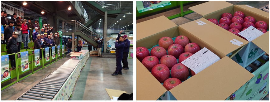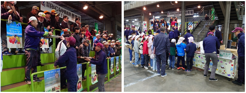 ▲市場関係者や社会見学に訪れた地元の小学生が初出荷のサンふじを試食する様子