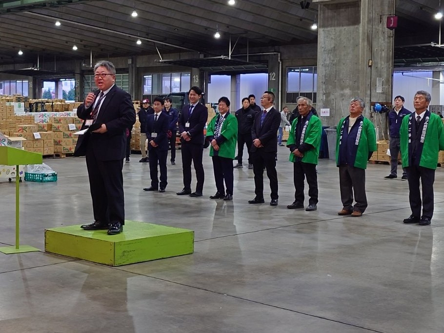 ▲セレモニーでは、JAあづみ 相馬常務理事(写真)はじめ、りんご部会長 二木副部会長、弊社松本支社長 西澤が